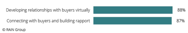 The next two challenges relate to relationships: developing relationships virtually (88% find this challenging) and connecting with buyers and building rapport (87%).